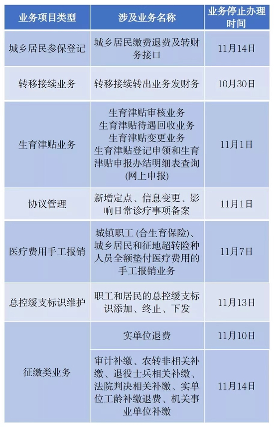 单位退费业务,自2022年11月10日起停止办理;审计补缴、农转非相关补缴、退役士兵相关补缴、法院判决相关补缴、机关事业单位补缴、单位工龄补缴退费业务,自2022年11月14日起停止办理。