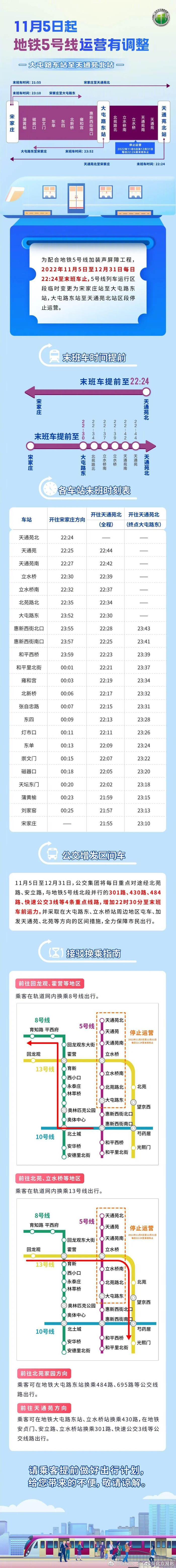 [11月5日起,#北京地铁5号线运营调整#]为配合地铁5号线加装声屏障工程,2022年11月5日至12月31日每日22:24至末班车止,5号线列车运行区段临时变更为宋家庄站至大屯路东站,大屯路东站至天通苑北站区段停止运营。
