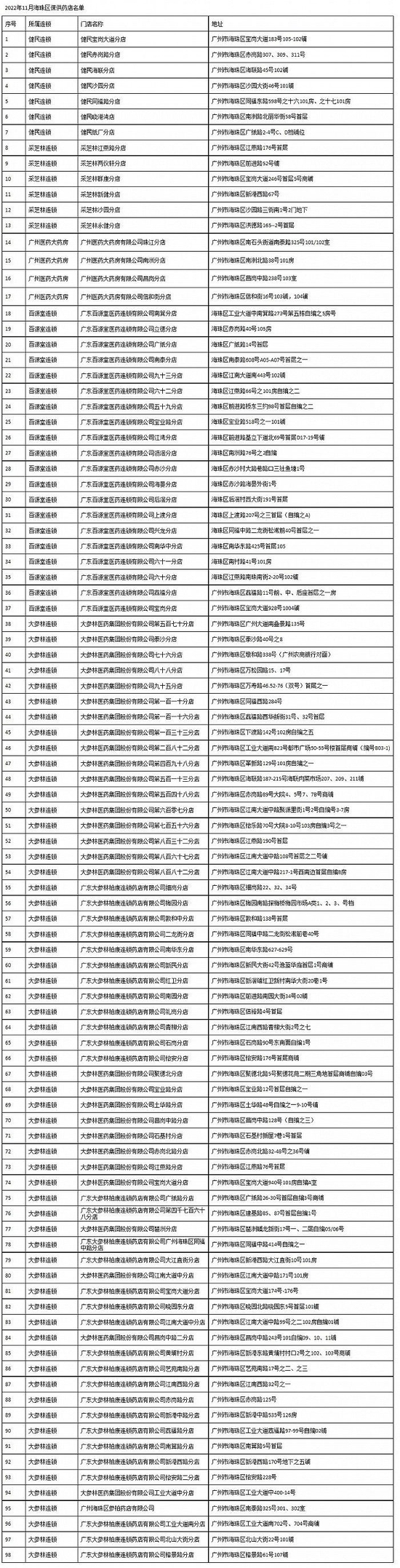 答:广州市市场监管局和海珠区市场监管局紧急协调广药集团和大参林集团,目前两家药业集团旗下的98家保供药店均正常营业,承担11月5日至11月7日这3天内的药品保供任务,海珠区辖区内有用药需求的市民朋友,可前往保供药店购药。如有困难或特殊情况,请及时联系社区工作人员。