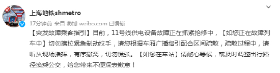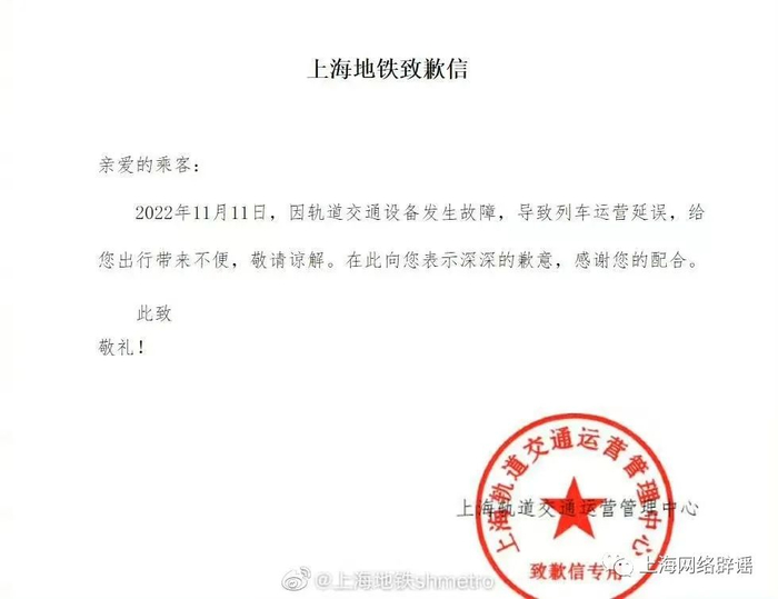 此外,受11号线影响的乘客可通过上海地铁官网运营专页获取致歉信,点击链接:http://t.cn/A6oBrI8W。
