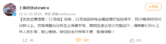 [突发运营信息:11号线]目前,11号线因供电设备故障仍在抢修中,预计晚点时间60分钟以上。交路调整为花桥至上海赛车场、南翔至迪士尼小交路运行,请乘客们听从工作人员引导,耐心等候。给您的出行带来不便,敬请谅解!