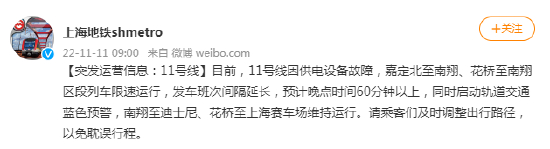 [突发运营信息:11号线]目前,11号线因供电设备故障,嘉定北至南翔、花桥至南翔区段列车限速运行,发车班次间隔延长,预计晚点时间60分钟以上,同时启动轨道交通蓝色预警,南翔至迪士尼、花桥至上海赛车场维持运行。请乘客们及时调整出行路径,以免耽误行程。
