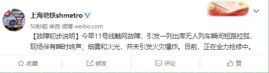 @上海地铁sh metro 微博消息,今早11号线触网故障,引发一列出库无人列车瞬间短路拉弧,现场伴有瞬时响声、烟雾和火光,并未引发火灾爆炸。目前,正在全力抢修中。