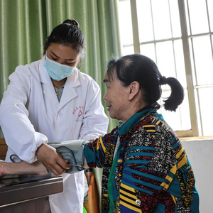 在融安县长安镇隘面村诊所,王雪丹准备为一名老人测量血压(5月18日摄)。新华社图