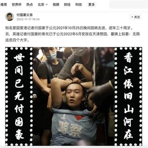 11月17日19时34分,付国豪父亲发文:知名爱国爱港记者付国豪于公元2021年10月25日晚间因病去逝,逝年三十周岁。另,英雄记者付国豪的骨灰已于公元2022年5月安放在天津憩园,墓碑上刻着:无限追息四个大字。