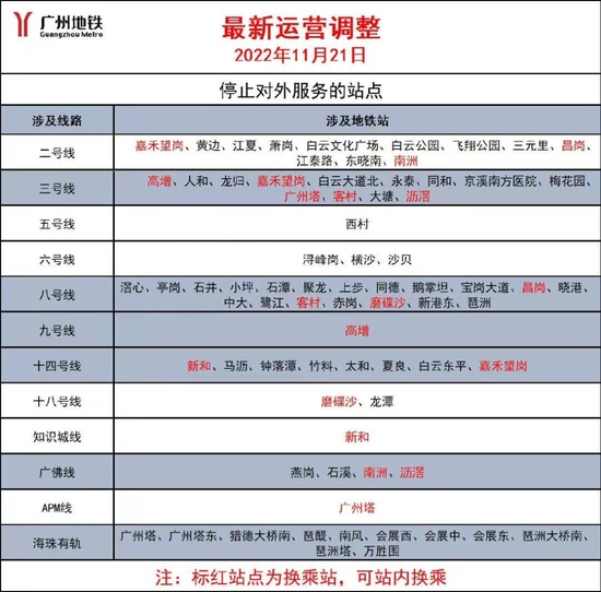 广州地铁通报,接市政府部门通知,因白云区疫情防控需要,11月21日运营时间起,二、三、六、八、九、十四号线(含知识城线)涉及白云区内的所有地铁站停止对外服务,其中涉及的换乘站保留站内换乘功能。
