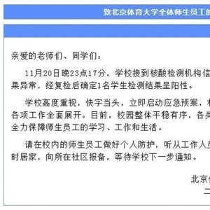 北京体育大学微信公众号消息,11月20日晚23点17分,学校接到核酸检测机构信息,发现1管“十混一”结果异常,经复检后确定1名学生检测结果呈阳性。
