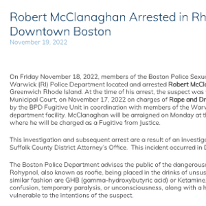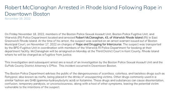 不过,警方并没有透露更多案情细节,比如此案发生在什么时间、具体案发地在哪里,仅称对麦克纳罕的逮捕是波士顿警方反性侵科和该市所属的萨福克县检方通过联合调查后做出的。