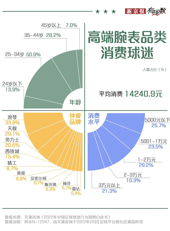 最后再来说说汽车和高端腕表,可能是整体的消费水平较高,所以这部分球迷大都是有一定生活阅历的成熟人士。近六成球迷在汽车上的花费超过了20万;而追求高端腕表,注重生活格调的球迷们最钟爱的腕表品牌是浪琴,其次是天梭和劳力士。