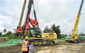 本报11月23日讯(记者张熙宇)“轰隆隆”作业声不绝于耳、工程车辆来回穿梭、大型设备持续作业……今天下午,记者在美兰机场快速通道项目施工现场看到,大型设备旋挖钻机正在钻孔,120多名工人分工合作,并为第一根桥梁工程桩浇筑混凝土。