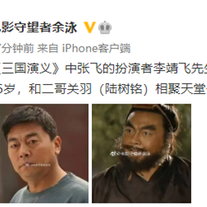据南京艺术学院口述历史研究中心特聘研究员余泳透露,11月24日,94版《三国演义》中张飞的扮演者李靖飞因病医治无效离世,终年65岁。