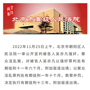 [#律师称吴亦凡需服刑完再被驱逐出境#]11月25日,北京市朝阳区人民法院一审公开宣判被告人吴亦凡强奸、聚众淫乱案,对被告人吴亦凡以强奸罪判处有期徒刑十一年六个月,附加驱逐出境;以聚众淫乱罪判处有期徒刑一年十个月,数罪并罚,决定执行有期徒刑十三年,附加驱逐出境。 北京市两高律师事务所高级合伙人王璞表示,吴亦凡需服刑完毕,再被驱逐出境。根据《刑法》第三十五条的规定:对于犯罪的外国人,可以独立适用或者附加适用驱逐出境。
