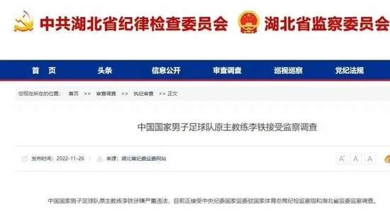 今天上午,湖北省纪委监委网站发布消息,中国国家男子足球队原主教练李铁涉嫌严重违法,目前正接受中央纪委国家监委驻国家体育总局纪检监察组和湖北省监委监察调查。