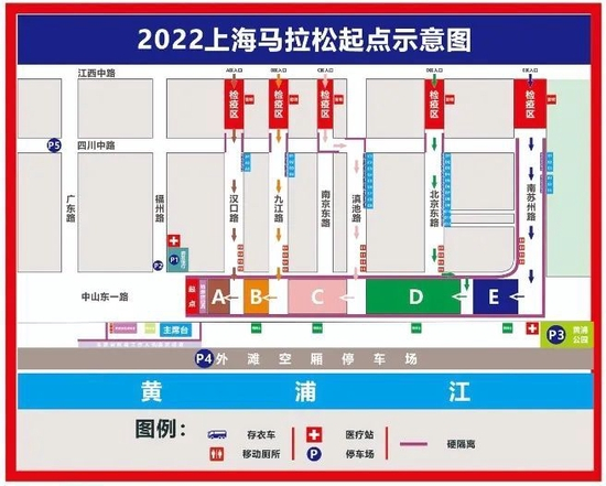 本次赛事将从江西中路起进行封闭,非参赛运动员将无法进入集结区。进入集结区后,请按地面蓝色点位站立,保持安全距离站立,候跑期间请保持佩戴口罩,发枪起跑后请摘下口罩。