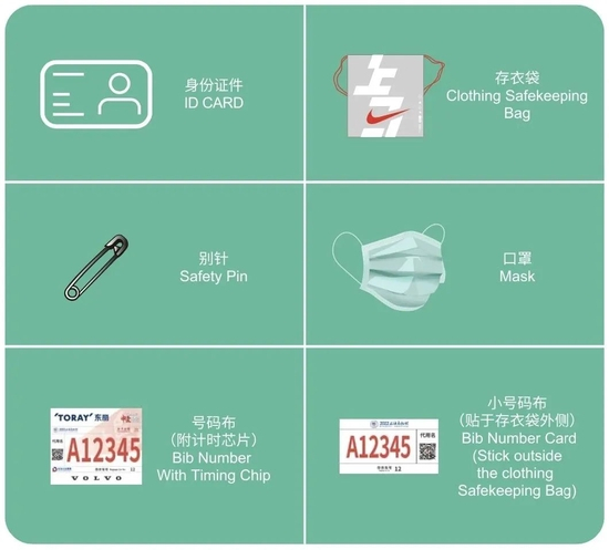 芯片号码布、别针、存衣袋、口罩是必不可少的参赛装备,请一定记得携带。