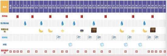 赛道沿途共设置8个喷淋站及4个冰站,跑者可以跑过喷淋站进行降温或取用浸水海绵或装有碎冰的冰袋,直接冷敷于面部及后脖颈部进行物理降温。