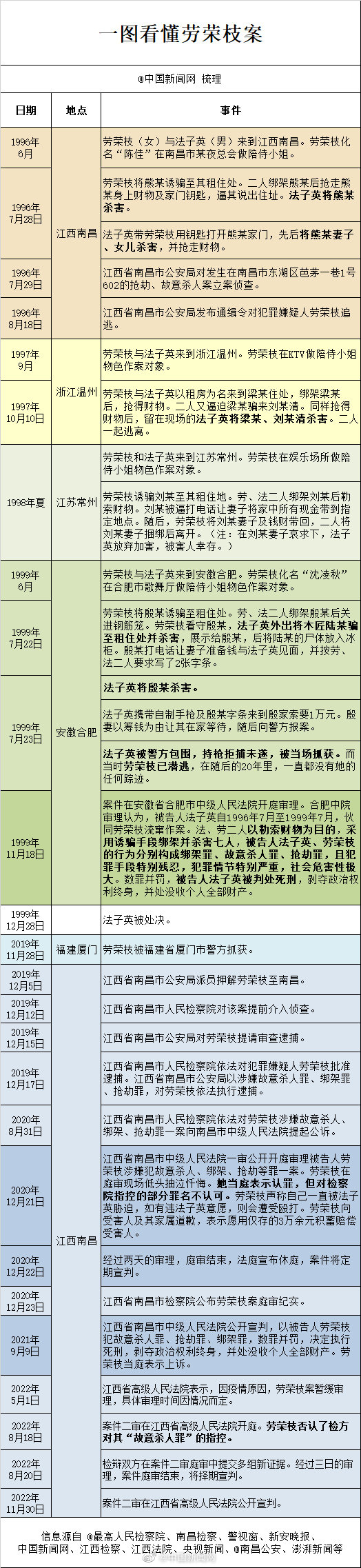 劳荣枝案时间线 中国新闻网 中国新闻网官方账号 2022.11.3010:42 关注 [#劳荣枝案时间线#]11月30日,江西省高级人民法院对劳荣枝故意杀人、抢劫、绑架上诉一案进行二审公开宣判。#劳荣枝案二审维持原判死刑#。#一图看懂劳荣枝案#↓