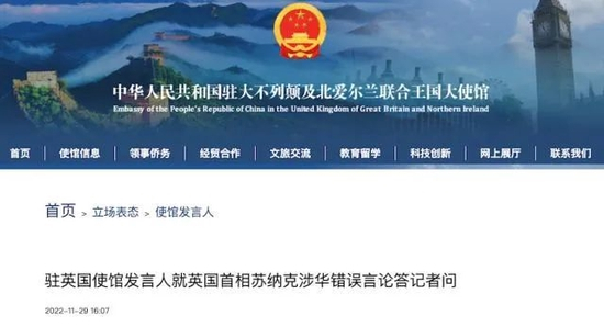 中国驻英使馆发言人就英国首相苏纳克涉华错误言论答记者问 图:中国驻英国大使馆网站截屏