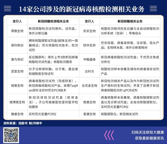 从14家公布招股书的公司看,2020年共录得23.23亿元的新冠核酸相关产品与服务收入,2021年为52.4亿元。