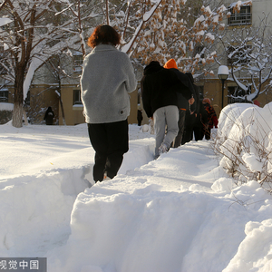 2022年11月27日,新疆塔城,沙湾市桃园一期小区,树上落满了积雪。视觉中国 资料图