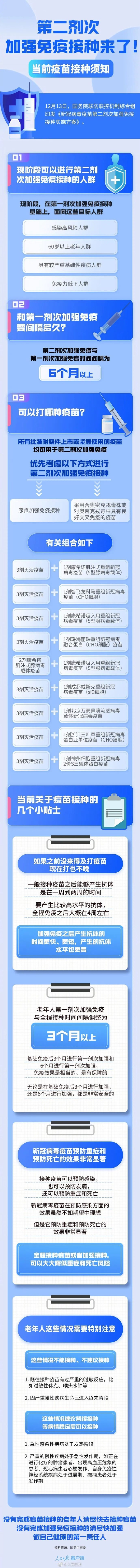 12月14日,国家卫健委发布新冠疫苗第二剂次加强免疫接种方案引发网友关注。根据方案,所有批准附条件上市或紧急使用的疫苗均可用于第二剂次加强免疫。优先考虑序贯加强免疫接种,或采用含奥密克戎毒株或对奥密克戎毒株具有良好交叉免疫的疫苗进行第二剂次加强免疫接种,有关组合如下: