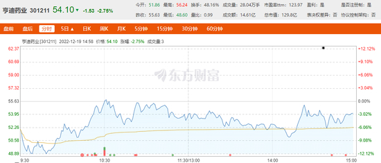 截至发稿,亨迪药业跌2.76%,报54.1元/股,总市值129.8亿元。