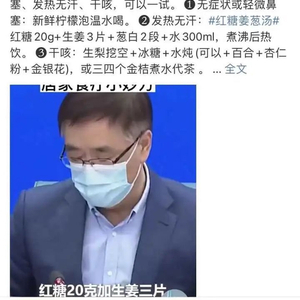 中国工程院宁光院士推荐发热无汗的阳性患者喝红糖姜葱汤,红糖20g+生姜3片+葱白2段+水300ml,煮沸后热饮。