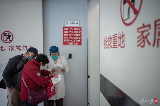 急诊抢救室门口,医护帮助病患家属整理就医材料。