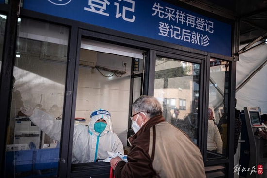 接诊台取号的病患络绎不绝,工作人员长时间身穿大白,多数时候午饭要到交班后才能吃上。