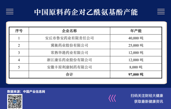 中国产业信息网数据显示,目前中国最大的对乙酰氨基酚生产商为鲁安药业公司,产能4万吨。2022年7月提交上市申报稿的冀南药业是其主要竞争对手,产能2.5万吨,另有两家产能过万企业。前述丰原药业旗下利康制药,录得产能8000吨,当前实际产量5000吨。
