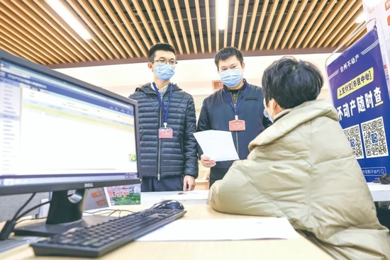 浙江省三门县纪委监委针对领导干部在房产交易方面存在的问题和漏洞,以个人自查申报、组织抽查核实、严肃查处并通报的流程开展专项治理,推动进一步健全完善领导干部房产交易管理和监督机制。图为该县纪检监察干部在房产交易管理部门查阅交易记录并进行分析研判。陈昌晖 摄