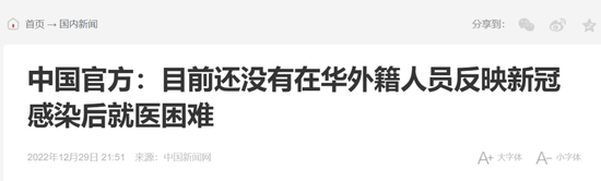 焦雅辉称,国家卫健委一直在关注舆情,包括关注人民群众对于看病就医的需求,目前还没有看到外籍人员反映在中国新冠感染就诊不及时或者就医困难的情况。各国使领馆也没有收到相关情况反映。