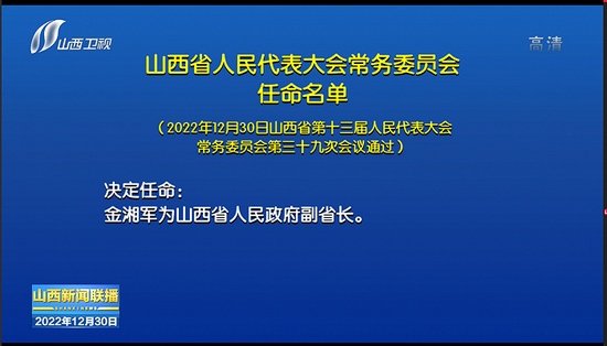 据山西卫视《山西新闻联播》12月30日消息,山西省十三届人大常委会第三十九次会议通过,决定任命:金湘军为山西省人民政府副省长、代理省长。
