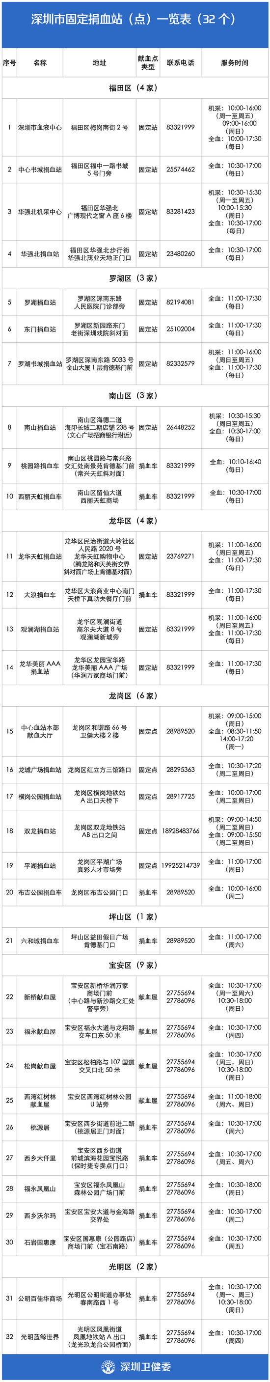 深圳市血液中心采血范围:福田区、罗湖区、南山区、盐田区、龙华区