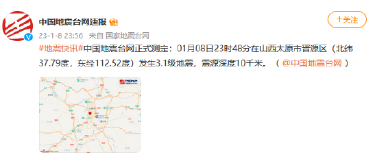 山西太原市晋源区发生3.1级地震,震源深度10千米 政府网站 2023.01.0900:01 关注 来源:中国地震台网 中国地震台网正式测定:01月08日23时48分在山西太原市晋源区(北纬37.79度,东经112.52度)发生3.1级地震,震源深度10千米。