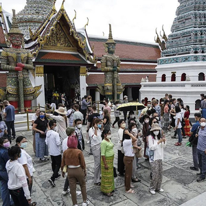 当地时间2023年1月8日,泰国曼谷,游客在大皇宫内参观玉佛寺。在中国放宽旅游限制后,泰国将欢迎中国游客入境,不实施特殊新冠健康限制,此举旨在提振该国经济,恢复旅游业。 图/视觉中国