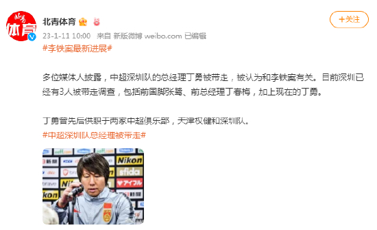 多位媒体人披露,中超深圳队的总经理丁勇被带走,被认为和李铁案有关。目前深圳已经有3人被带走调查,包括前国脚张鹭、前总经理丁春梅,加上现在的丁勇。