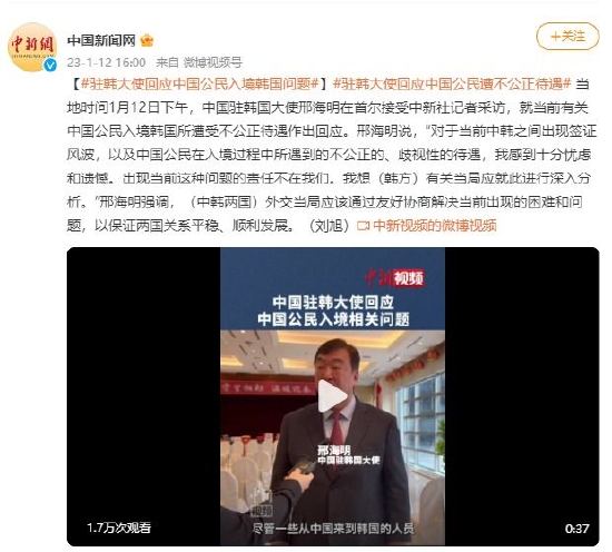 当地时间1月12日下午,中国驻韩国大使邢海明在首尔接受中新社记者采访,就当前有关中国公民入境韩国所遭受不公正待遇作出回应。邢海明说,“对于当前中韩之间出现签证风波,以及中国公民在入境过程中所遇到的不公正的、歧视性的待遇,我感到十分忧虑和遗憾。出现当前这种问题的责任不在我们。我想(韩方)有关当局应就此进行深入分析。”邢海明强调,(中韩两国)外交当局应该通过友好协商解决当前出现的困难和问题,以保证两国关系平稳、顺利发展。(刘旭)