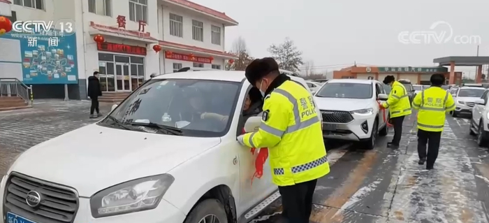 降雪天气导致路面湿滑,交警部门执行一级勤务,全警上路,在路面加强巡逻,快速处置交通事故,高速交警还在服务区给返乡车辆系上红丝带,提醒车主降低车速,不要疲劳驾驶。