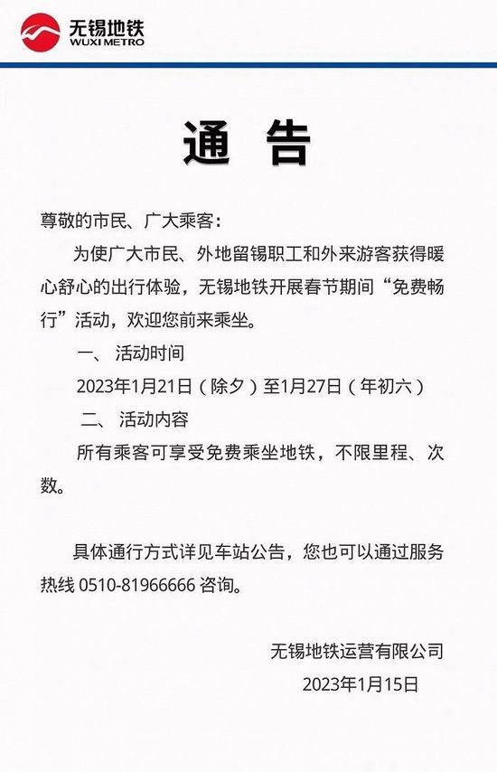 1月15日,江苏无锡地铁发布通告,为使广大市民、外地留锡职工和外来游客获得暖心舒心的出行体验,无锡地铁开展春节期间“免费畅行”活动。活动时间:2023年1月21日(除夕)至1月27日(年初六),所有乘客可享受免费乘坐地铁,不限里程、次数。