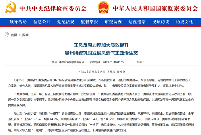1月15日,贵州省纪委监委召开2022年全省党风廉政建设和反腐败工作新闻发布会。通报的数据显示,在信访总量、问题线索同比下降的情况下,立案数、处分人数、移送司法机关人数等审查调查主要指标均实现较大增长。其中,省纪委监委立案审查调查省管干部51人,同比上升24.4%。