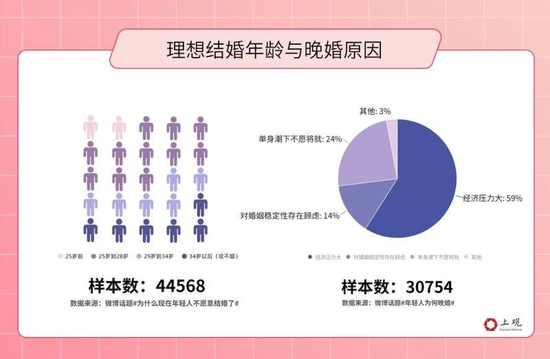 之所以选择晚婚,来自工作、购房、教育的经济压力是主要原因,占比接近60%。