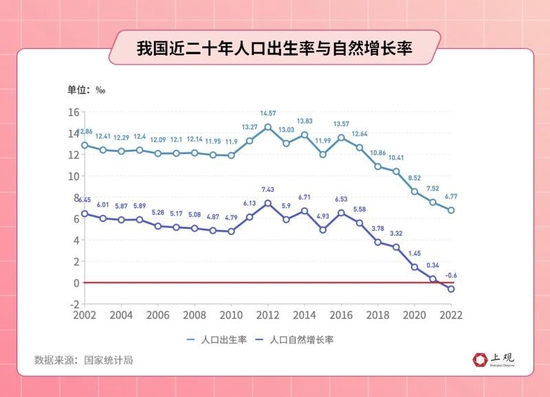 值得注意的是,2022年我国人口出生率为6.77‰,人口自然增长率-0.60‰,这是我国自1960年(-4.57‰)后人口自然增长率首次呈现负数。