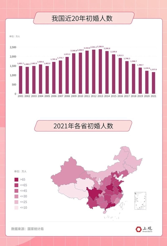 据国家统计局《中国统计年鉴2022》显示,2021年我国初婚(即第一次结婚)人数为1157.8万人,比去年减少70.8万人。这也是多年来初婚人数首次跌破1200万人,创下自1985年以来的新低。