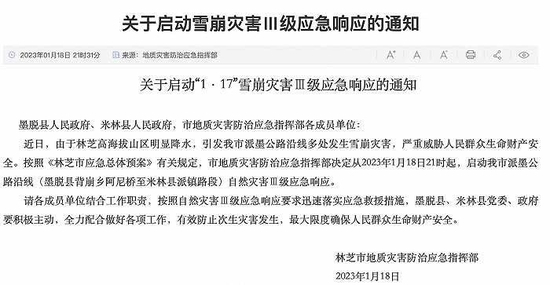 据林芝市政府网站1月18日消息,近日,由于林芝高海拔山区明显降水,引发林芝市派墨公路沿线多处发生雪崩灾害,严重威胁人民群众生命财产安全。按照《林芝市应急总体预案》有关规定,市地质灾害防治应急指挥部决定从2023年1月18日21时起,启动林芝市派墨公路沿线(墨脱县背崩乡阿尼桥至米林县派镇路段)自然灾害Ⅲ级应急响应。