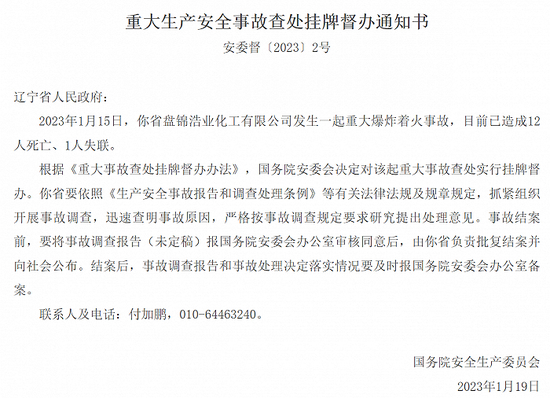 应急管理部网站1月19日消息,2023年1月15日,辽宁省盘锦浩业化工有限公司发生一起重大爆炸着火事故,目前已造成12人死亡、1人失联。根据《重大事故查处挂牌督办办法》,国务院安委会决定对该起重大事故查处实行挂牌督办。