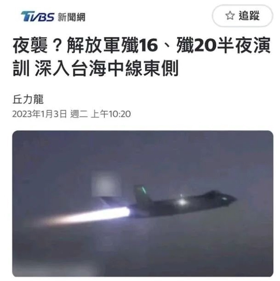 此外,今年1月初,央视也曾发布歼-20夜间出动的视频。台湾媒体由此猜测,解放军空军歼-16、歼-20等战机在元旦半夜飞越了“海峡中线”,甚至“史无前例”逼近桃园、新竹12海里近空,演练在夜间环境下对台湾的突袭能力。