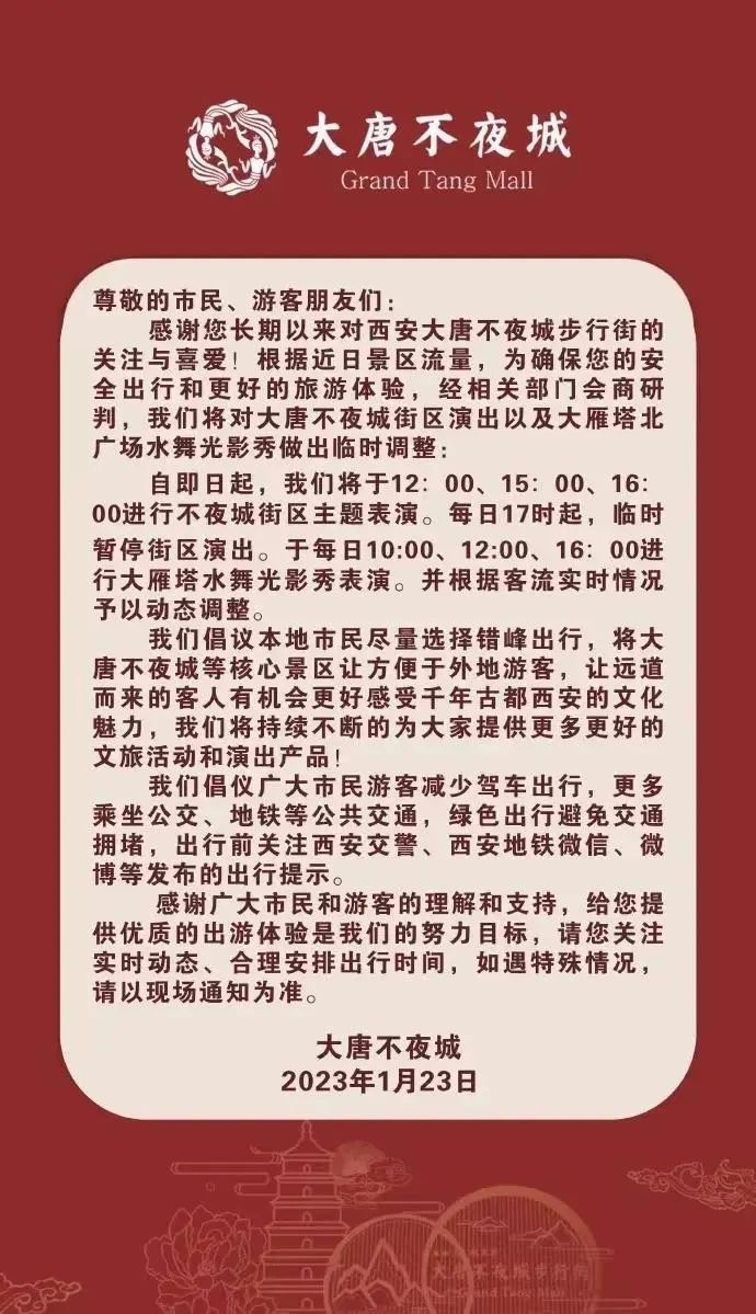 为确保游客的安全和良好的游览体验,1月23日起,西安城墙景区、大唐不夜城、大唐芙蓉园等多个景点采取临时限流措施或演出时间调整措施。各景区还倡导本地市民尽量选择错峰出行,让远道而来的客人有机会更好感受西安的魅力。