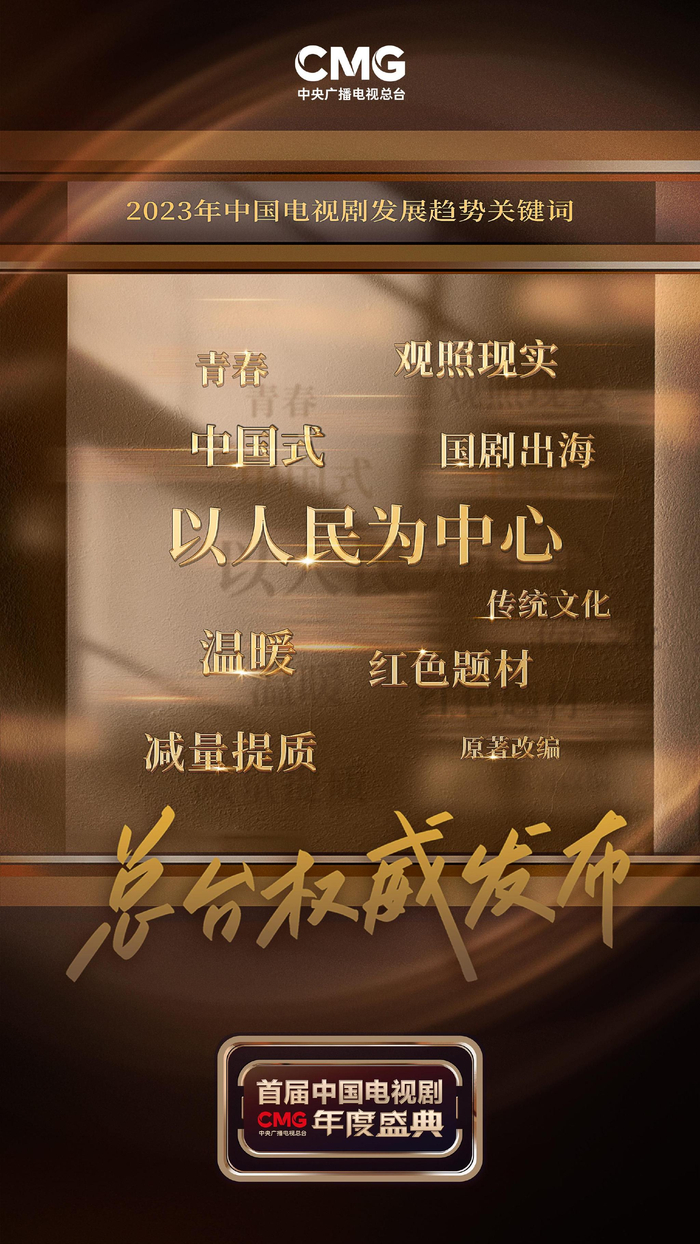 CMG首届中国电视剧年度盛典还为观众权威发布了2023年中国电视剧发展趋势关键词:“以人民为中心”“中国式”“红色题材”“减量提质”“温暖”“传统文化”“观照现实”“原著改编”“青春”“国剧出海”。优秀的电视剧能够成为行业的创作标杆,积极正确的发展趋势可以引领品质。这十大关键词凝结着广大观众对中国电视剧的期望,是观众所选,也是观众心之所向。