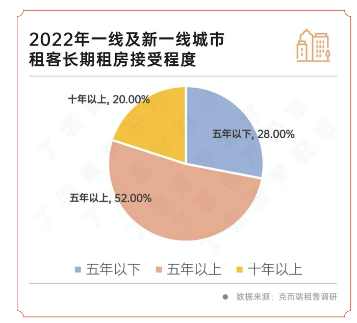 据克而瑞租售调研,根据一线城市的调研结果,5年以上租房的占比达到了52%,还有20%的客户接受10年以上租房。
